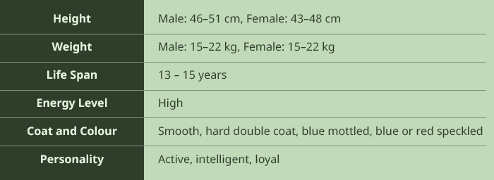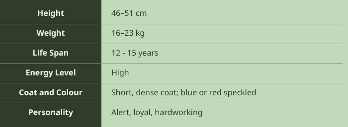 Australian Cattle Dogs are compact yet powerful, known for their muscular build, work drive, herding skills, intelligence, agility, and endurance. They are a mix of various breeds like Dalmatians, Blue Merle Collies, and the native Australian Dingo and are commonly known as Blue Heelers or Queensland Heelers.